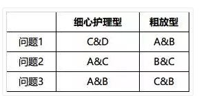 对于样本量为10的上述调查结果经计算,细心护理型占50%,粗放型30%,异常数据20%。