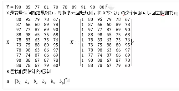 我们的例子提出了5个变量性问题,所以要回归的线性方程具有5个变量,形式如下: